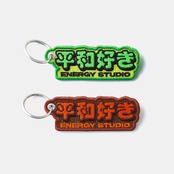 日本語で表現された『平和好き』のロゴをフロントに、バックには オプアートのグラフィックを贅沢な両面刺繍で製作されたキーホルダー。 Embroidered by Laugh and Sunnyday.
